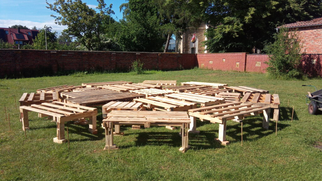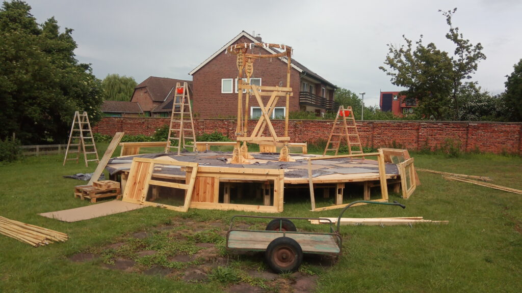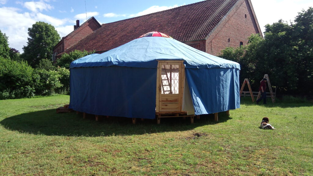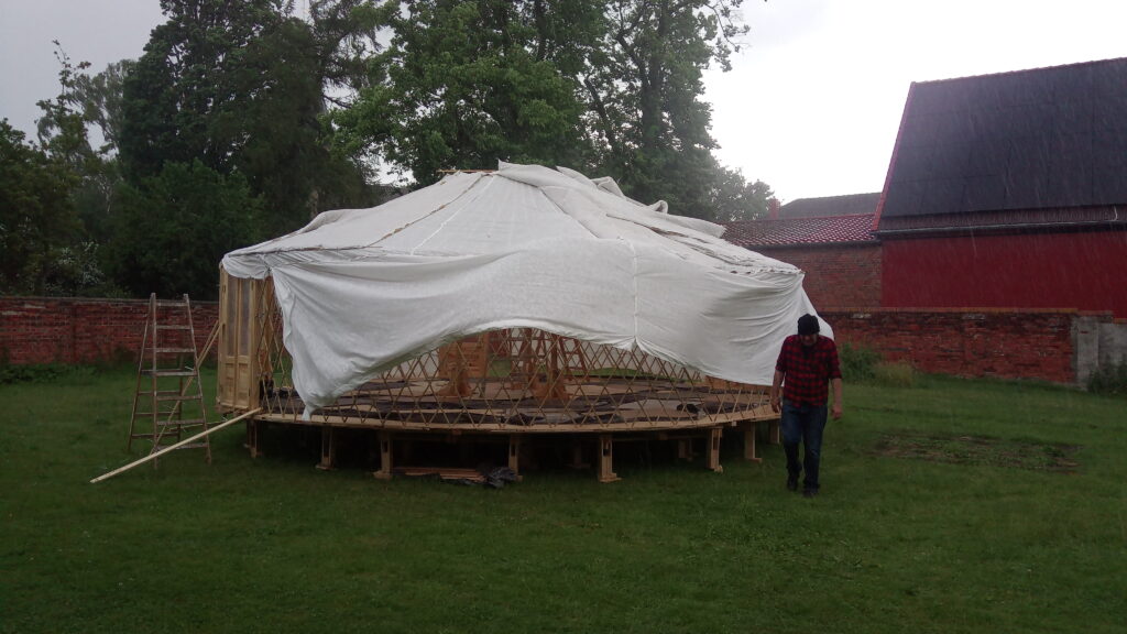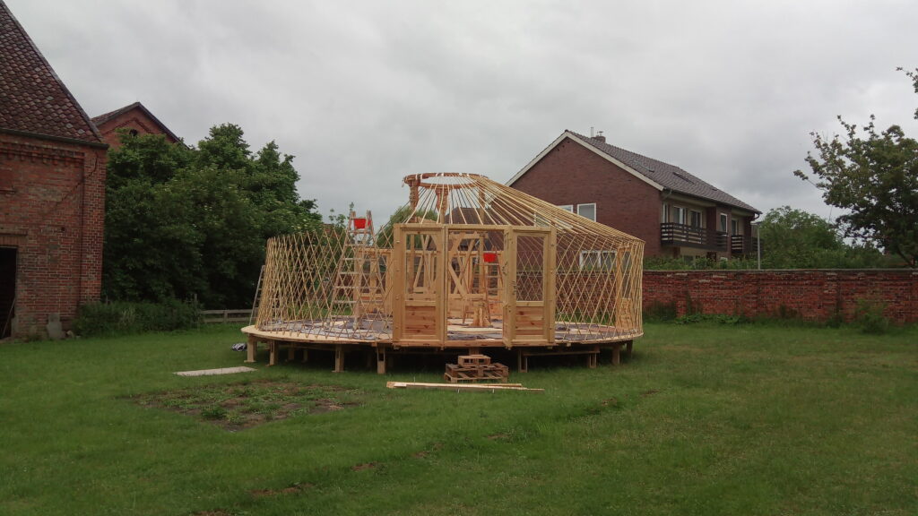 Jurtenaufbau Optimale Platzwahl Abstecken des Bereichs Aufbau der Unterkonstruktion Der fertige Jurtenboden Vorbereitung der Türenund Mittelkonstruktion Vor dem Sturm Während des Sturms In den letzten Zügen Bezugsfertig
